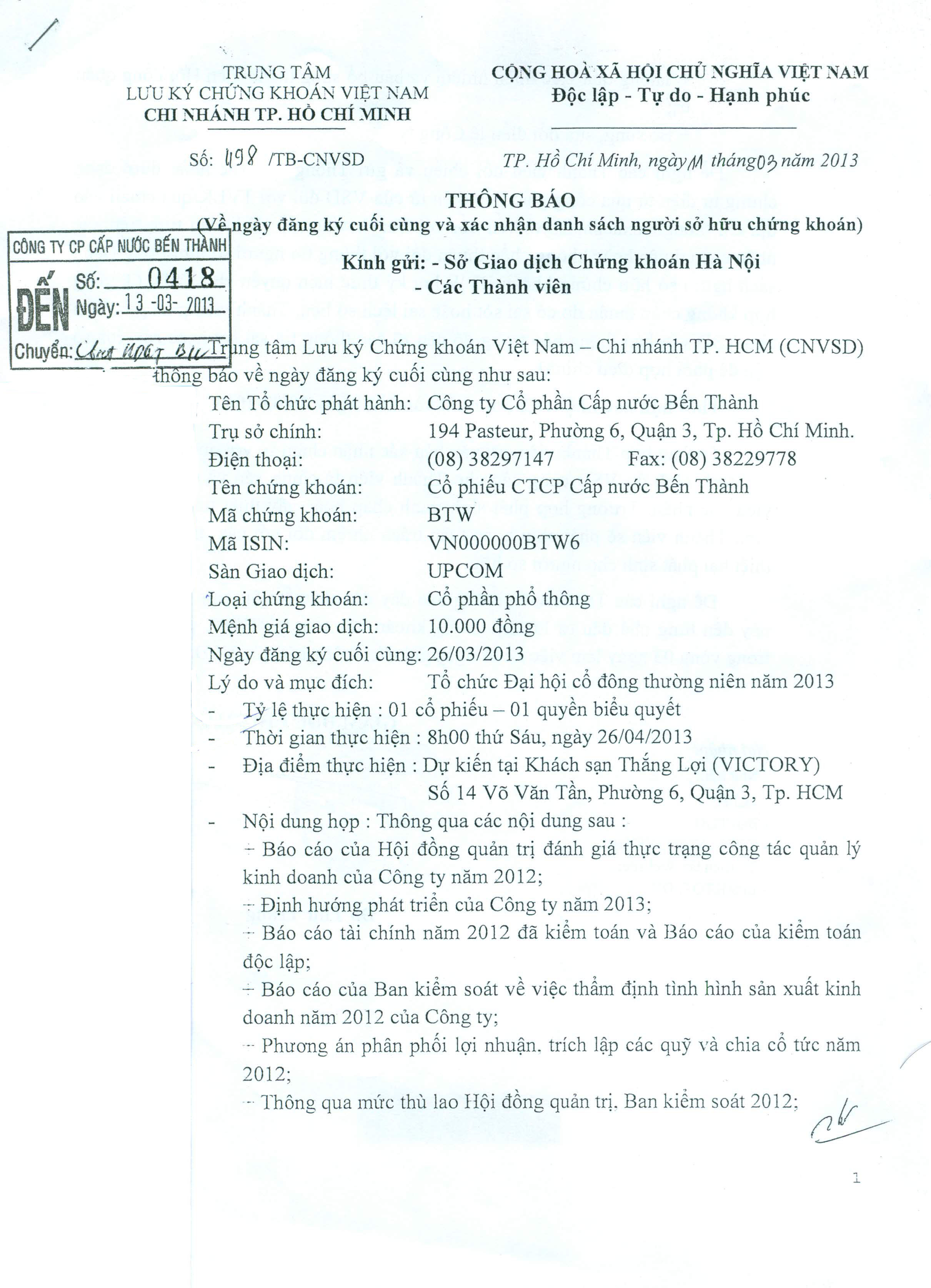 - Công ty Cổ phần Cấp nước Bến Thành công bố thông tin chọn đơn vị kiểm toán (18/08/2015)