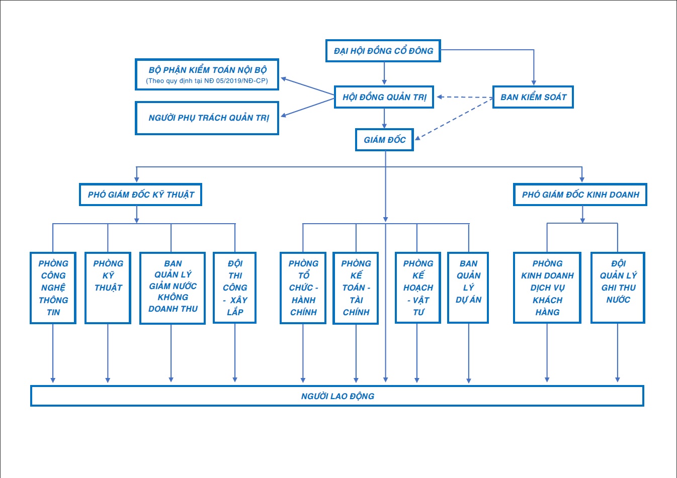 Cơ cấu tổ chức của Công ty bao gồm Hội đồng quản trị, Ban kiểm soát, Ban Giám đốc, Kế toán trưởng, 10 phòng, ban, đội chuyên môn – nghiệp vụ và 01 Bộ phận kiểm toán nội bộ:
